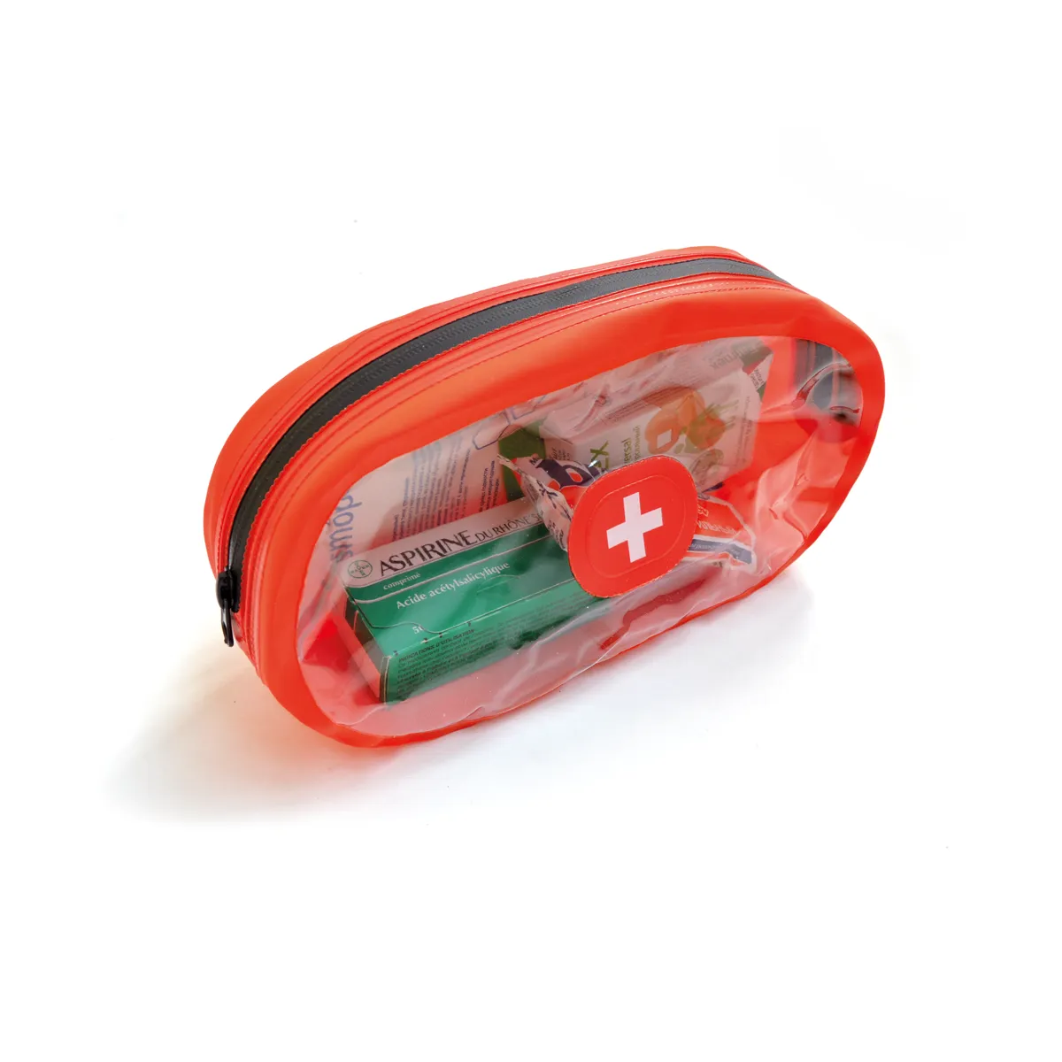 Гермоаптечка на молнии, с прозрачной стенкой. Имеет петлю с полукольцом для фиксации на рюкзак.
