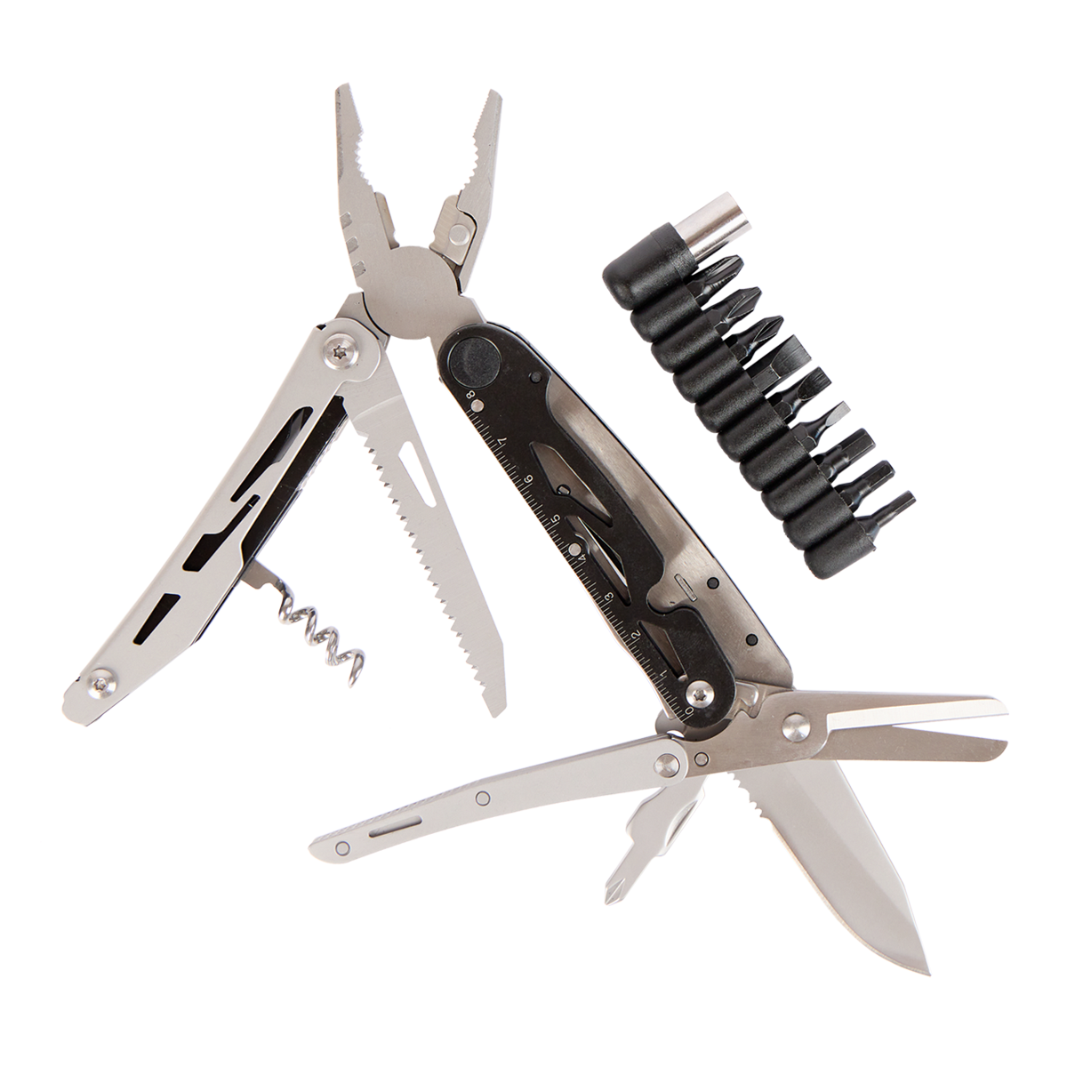 Состав: Пассатижи, кусачки, ножницы, линейка, штопор, пила, открывашка, отвёртка,стропорез, набор бит.